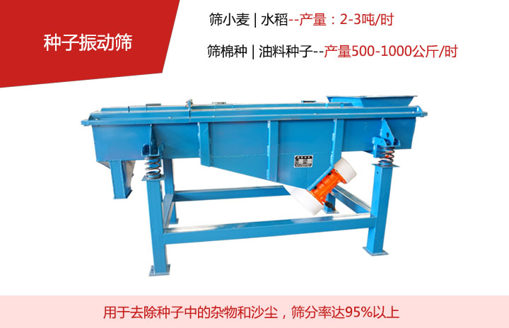 種子振動篩主要是去除種子中的雜物和沙塵使用,該機篩選大豆和玉米每小時3-5噸,篩選小麥和水稻每小時2-3噸,篩選棉種和油料種子每小時500-1000公斤。對糧食和油料里面的灰塵,碎屑,壞糧及小石子等雜質,篩分率達到95%以上。